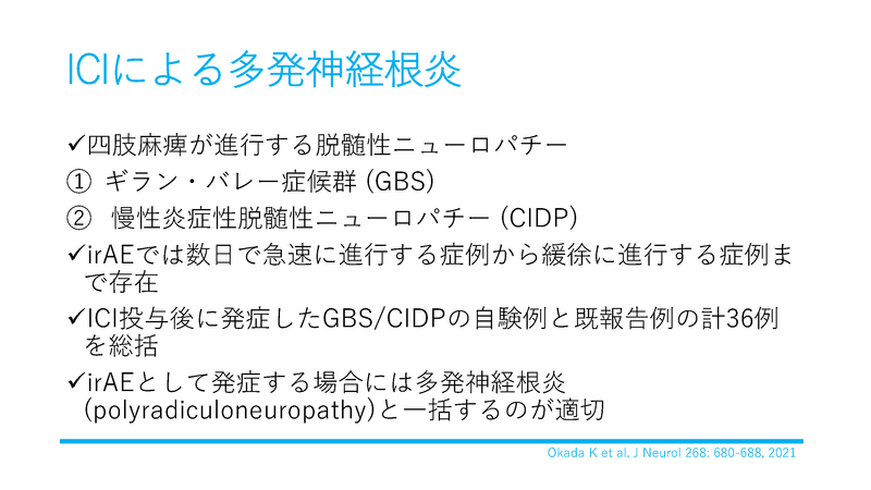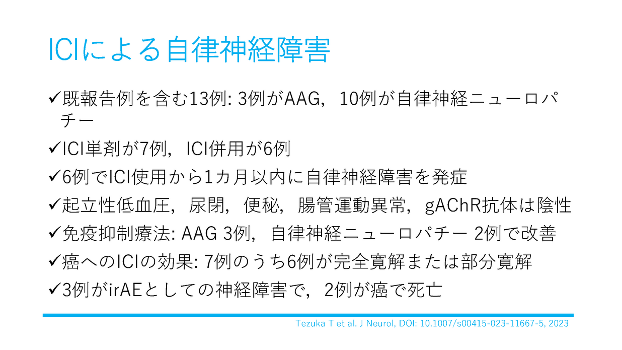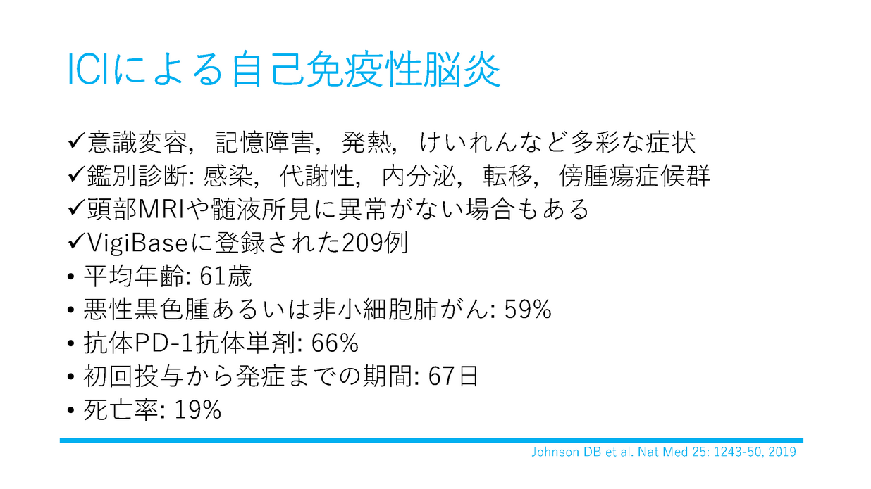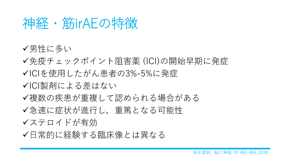 免疫チェックポイント阻害薬(immune checkpoint inhibitors:ICIs)による治療が広く行われるようになるにつれ,免疫関連有害事象として発症する神経系疾患の臨床的な特徴が明らかになってきました.