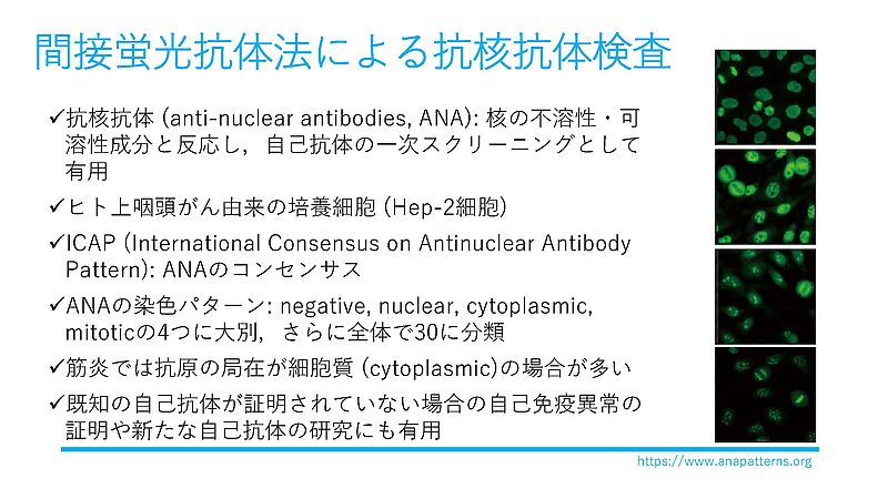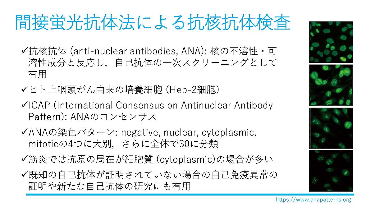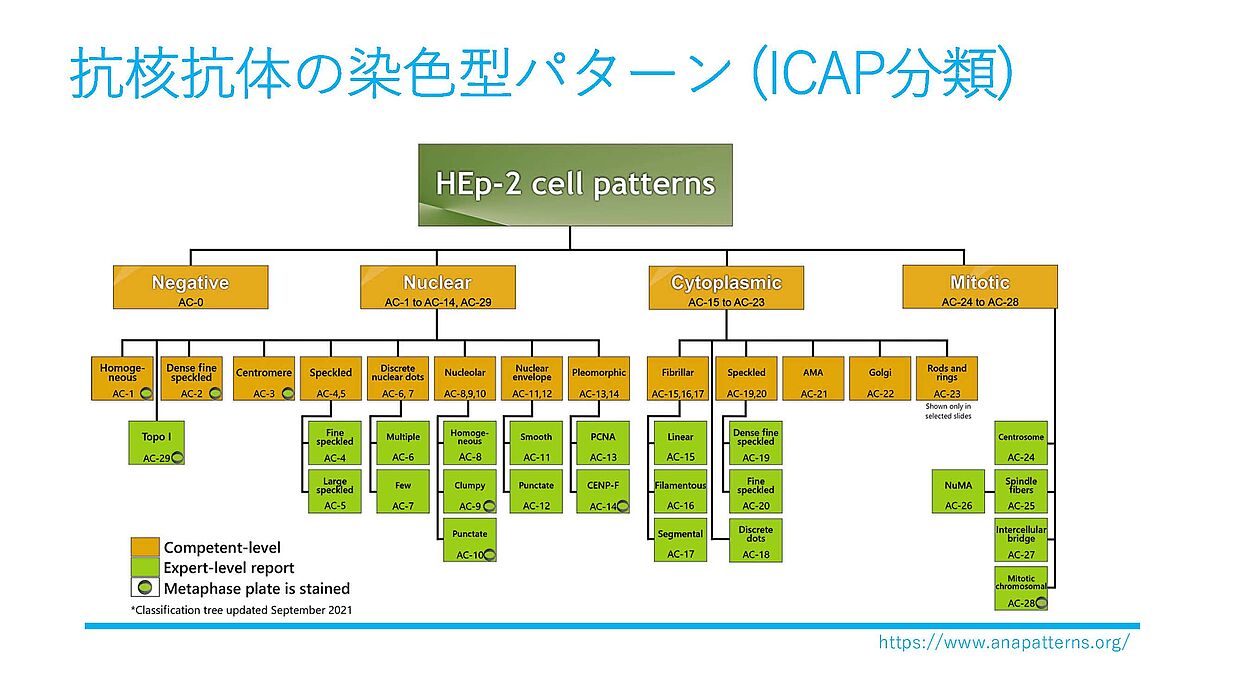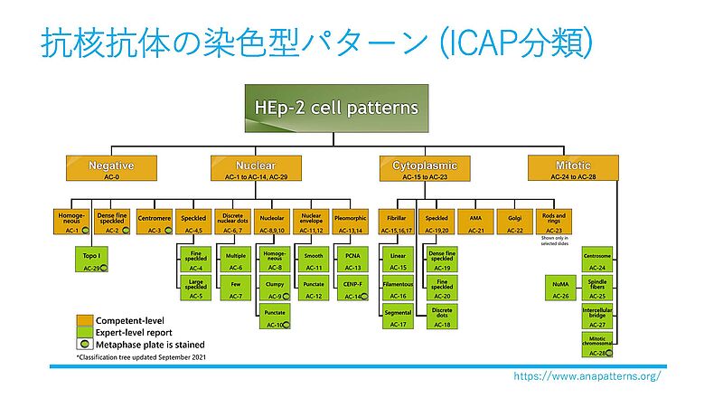 間接蛍光抗体法による抗核抗体検査は, 膠原病などの領域では自己抗体のスクリーニング検査として行われます(図5). 近年, 国内でもICAP(International Consensus on Antinuclear Antibody (ANA) Patterns)分類に基づき抗核抗体の報告様式が詳細になり, 核だけではなく細胞質についても染色パターンの報告もされるようになっています(図6)10). irAEでは, どのような自己抗体が出現するのか分からないため, ガイドラインでも抗核抗体検査が推奨されています.