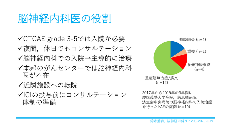 脳神経内科医に求められる役割としては, やはり重症例へのコンサルテーション等が必要になると思います. 図4に示すように脳神経内科で入院治療を行った症例を見ると, やはり筋疾患関連が多いことが分かります7). 海外と異なり日本のがんセンターでは脳神経内科医が不在のこともあるので, ICIの投与前にコンサルテーション体制を準備しておくことが望ましいと考えます.