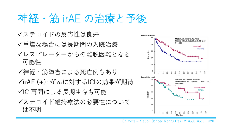 一方でirAEのある患者さんでは, 長期生存例もあり, がんに対するICIの効果も期待できることが示されています6). ステロイドの維持療法については, どれだけの量を, どのぐらいの期間で投与すべきかについては, まだ方針は定まっていません. 概して言えば早めに減らすことが多いと思いますが, irAEが再燃することもあるので患者様の経過を見ながら減らしています.