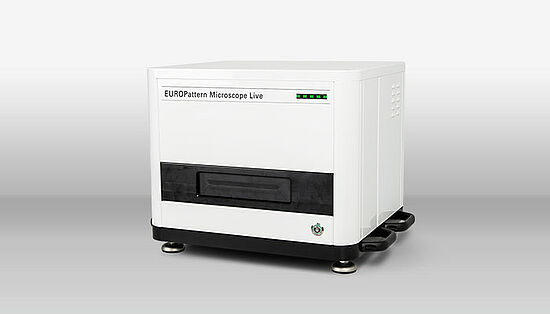 Up to 50 reaction fields are loaded into the microscope at once. Using the 20x objective, a high-resolution camera and high-quality optic components, a large number of substrates can be automatically viewed at the microscope, e.g. tissues, HEp-2 cells, Crithidia, granulocytes and antigen-expressing cells. Focusing is performed fully automatically by a new laser focusing technology. A self-regulating long-life LED as excitation source and the automated microscope calibration based on an integrated fluorescence standard ensure consistent immunofluorescence signal intensity. Owing to its compact design and the opaque housing, the EUROPattern Microscope Live can be used in any room and independently of the light conditions.